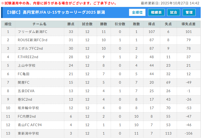 1位:フリーダム新潟FC、2位:ROUSE新潟FC3rd、3位:エボルブFC2nd、4位:F.THREE2nd、5位:上山中学校、6位:FC亀田、7位:関屋中学校、8位:五泉DEVA、9位:巻SC2nd、10位:坂井輪中学校、11位:内野中学校2nd、12位:青山FC AFC94、13位:東新潟中学校
