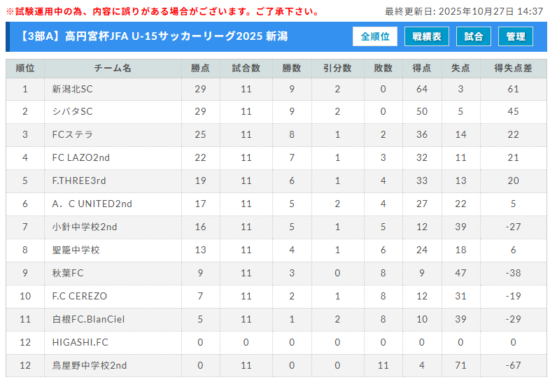 1位:新潟北SC、2位:シバタSC、3位:FCステラ、4位:FC LAZO2nd、5位:F.THREE3rd、6位:A.C UNITED2nd、7位:小針中学校2nd、8位:聖籠中学校、9位:秋葉FC、10位:F.C CEREZO、11位:白根FC.BlanCiel、12位:鳥屋野中学校2nd
