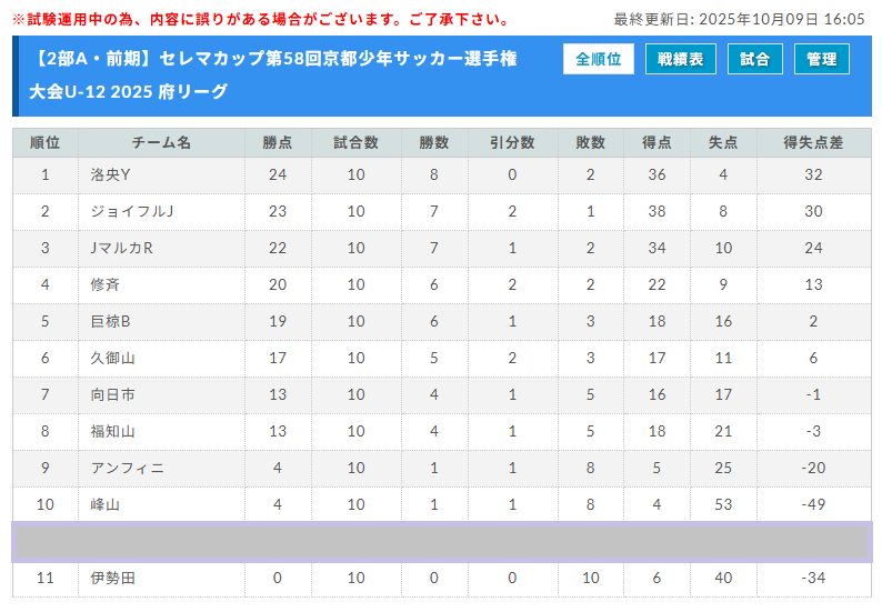 1位:洛央Y、2位:ジョイフルJ、3位:JマルカR、4位:修斉、5位:巨椋B、6位:久御山、7位:向日市、8位:福知山、9位:アンフィニB、10位:峰山、11位:伊勢田