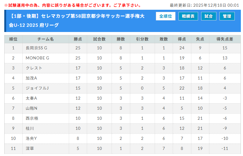 1位:長岡京SS G、2位:MONOBE G、3位:クレスト、4位:加茂A、5位:ジョイフルJ、6位:太秦A、7位:山階N、8位:西京極、9位:桂川、10位:洛央Y、11位:深草