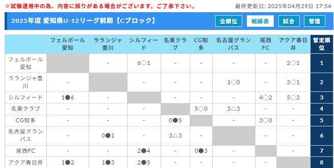 ・前期リーグ戦の10試合を実施したチームは、全⽇本 U-12サッカー選⼿権⼤会愛知県⼤会への出場権を獲得する。