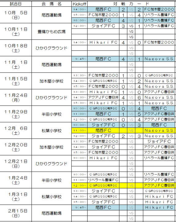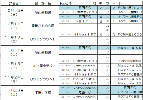 リベラール豊橋、Hikari FC、ジョイアFC、NagoyaSS、加木屋2000、アクア春日井、CG知多、尾西FC