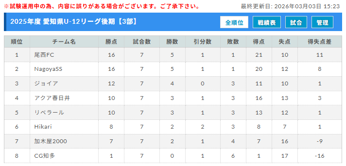 後期3部リーグ【最終結果】2/28 優勝:尾西FC