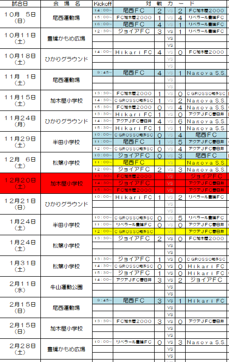 参照:Hikari FC HP、FCシリウスHP、DREAM愛知JFC HP、瀬戸FC HP、名古屋グランパスHP、尾西FC HP
