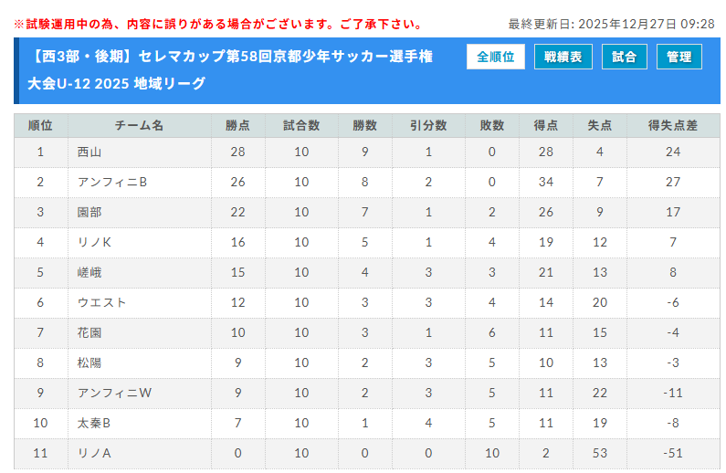 1位:西山、2位:アンフィニB、3位:園部、4位:リノK、5位:嵯峨、6位:ウエスト、7位:花園、8位:松陽、9位:アンフィニW、10位:太秦B、11位:リノA