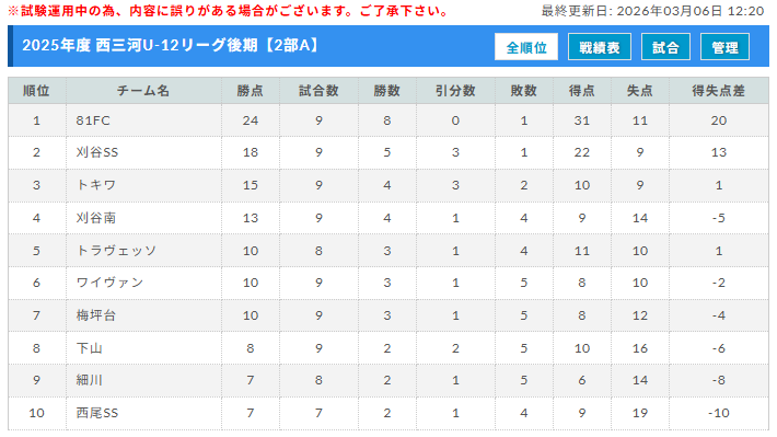 2部Aリーグ 2/28結果更新 優勝:81FC刈谷 あと2試合