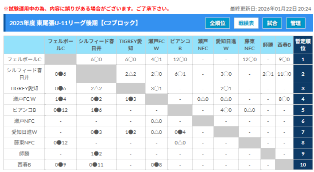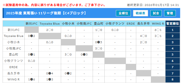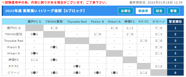 2025年度 東尾張U-11リーグ(愛知)後期 1/17,18結果更新!入力ありがとうございます!次回1/24,25 未判明の結果入力もお待ちしています!