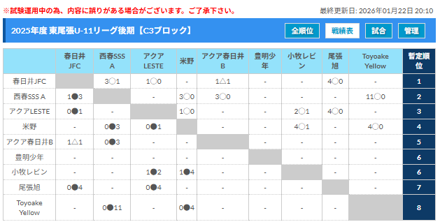 東尾張U11前期リーグC3ブロックの結果情報ありがとうございます!