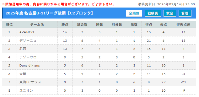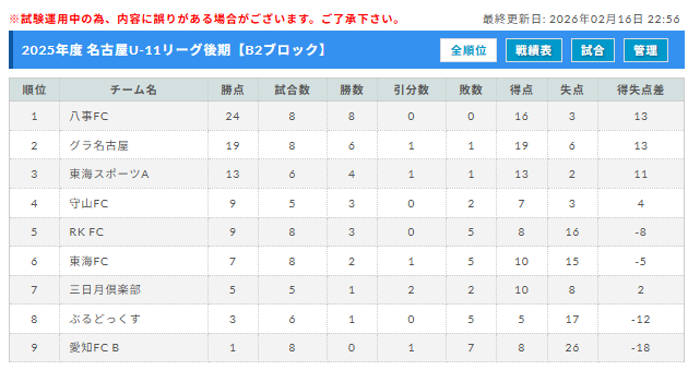 リーグ表を作成し、大会ページに反映させていただきました。
