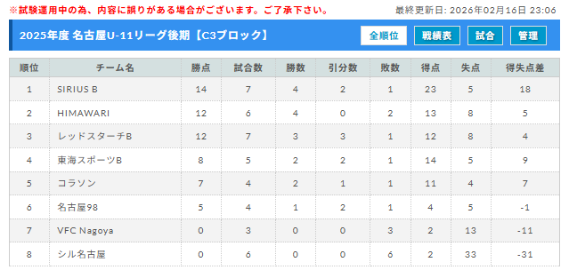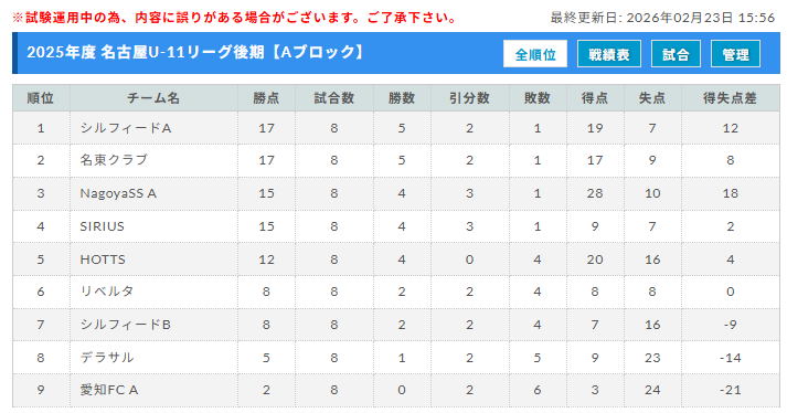 2025年度 名古屋U-11リーグ(愛知)2/23結果更新!AブロックはシルフィードAが優勝!入力ありがとうございます!未判明結果募集