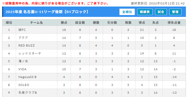 後期リーグの結果にて、2026年度 U12リーグ前期のブロック分けに反映させる。