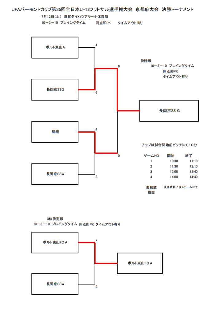 (3)決勝トーナメントは2次ラウンドのブロック1位チームによるトーナメント(ノックアウト)方式とし、優勝チームが 京都府代表チームとして全国大会へ出場となる(3位決定戦も行う)。(西宇治会場)