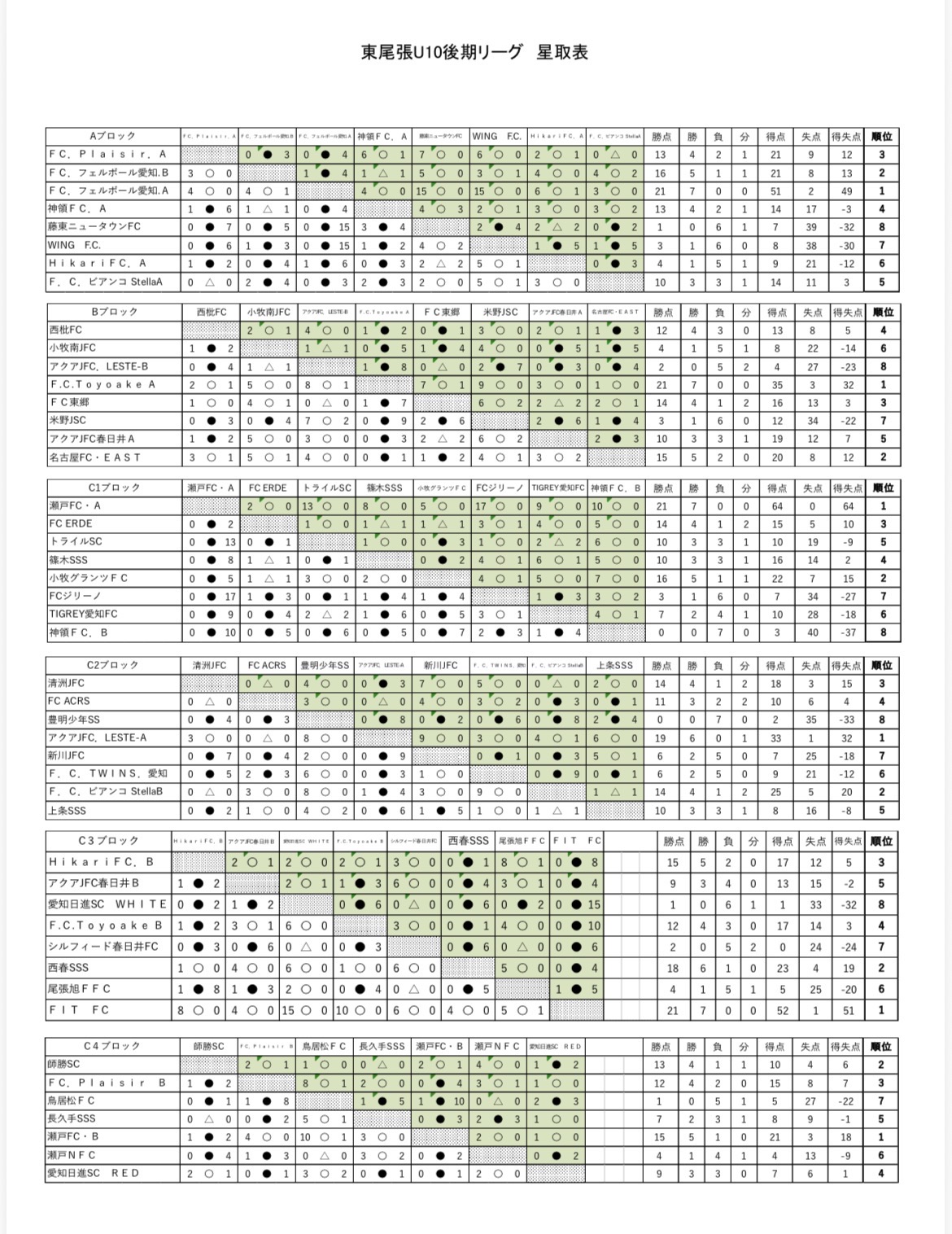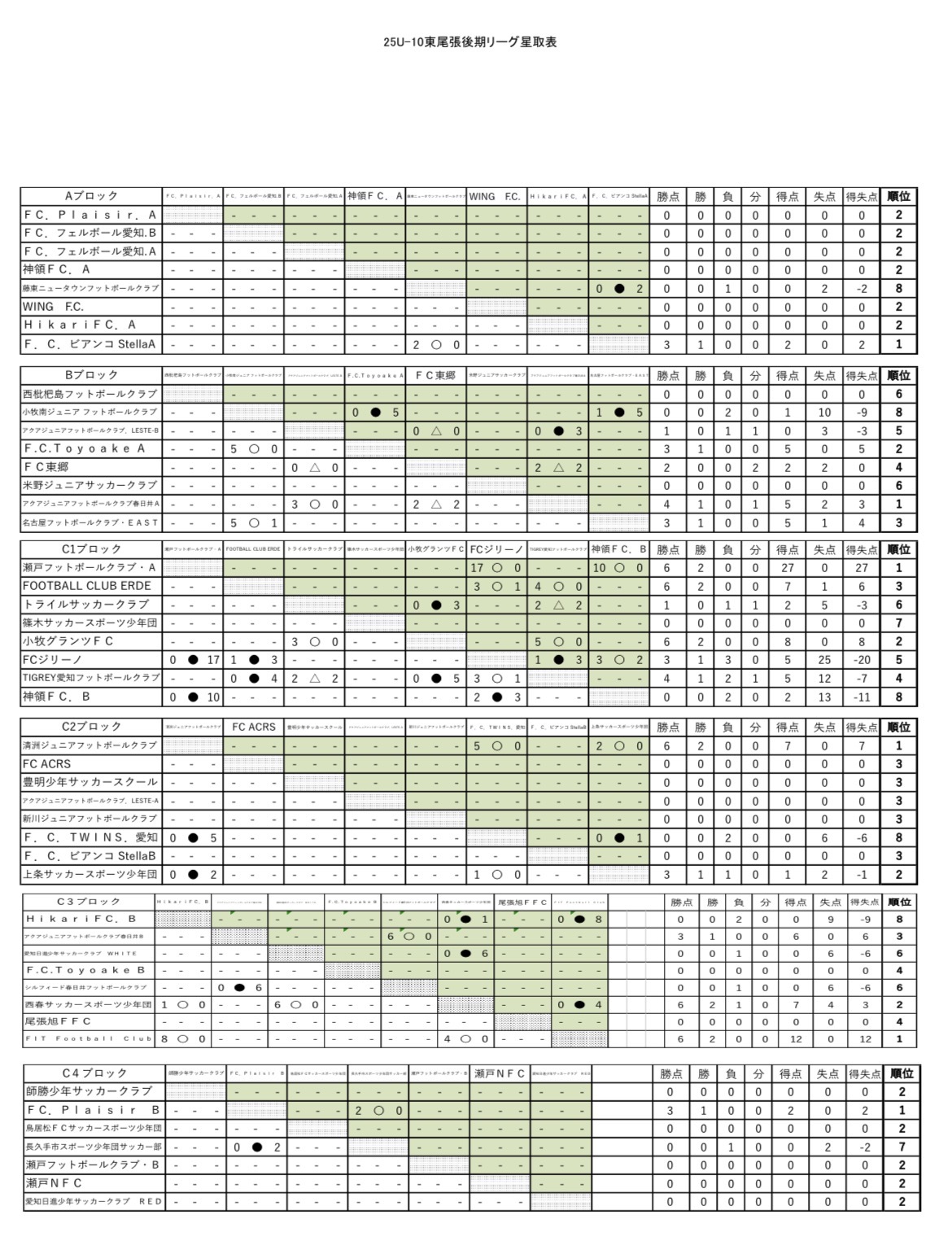Bブロック【最終結果】10/18 FC Plaisir A優勝!