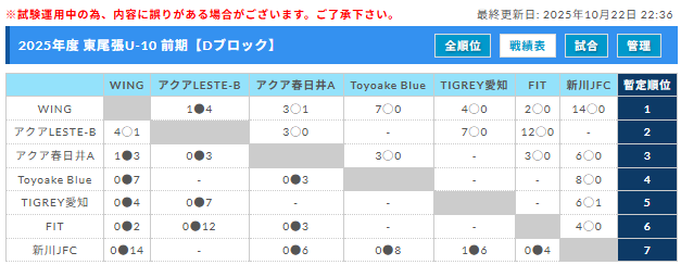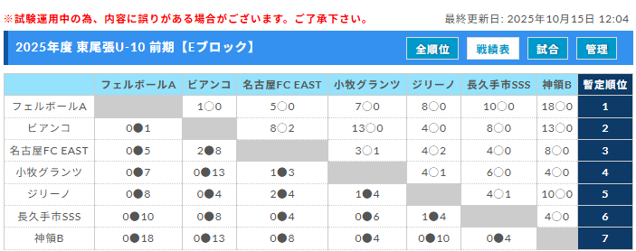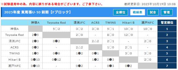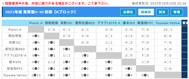 2025年度 東尾張U-10リーグ(愛知)10/18,19結果更新!Bブロックも終了・優勝はPlaisir A!入力ありがとうございます 次回10/25,26