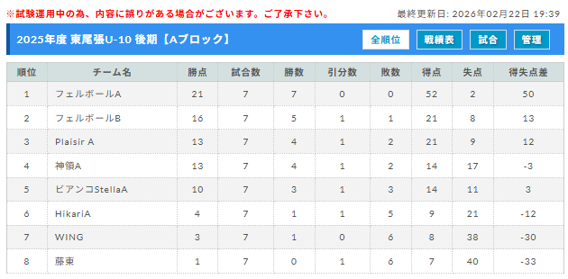 後期リーグ最終結果です