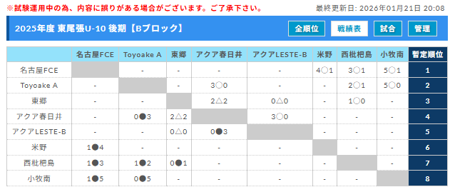 1位:フェルボールB、2位: HikariFC A、3位: FC東郷 、4位:プレジールB、5位: 西春SSS、6位: トライル、 7位:瀬戸SC、8位: 愛知日進