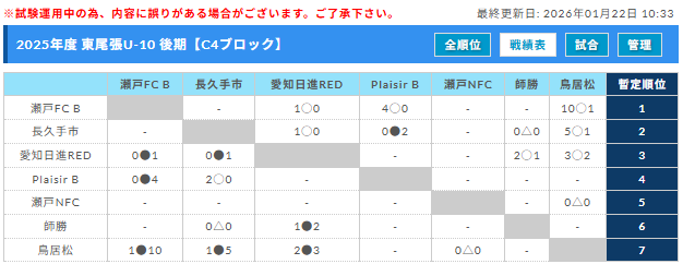 Bブロック【最終結果】10/18 FC Plaisir A優勝!