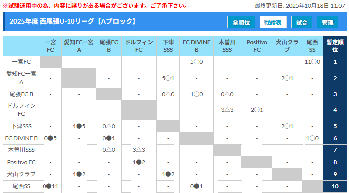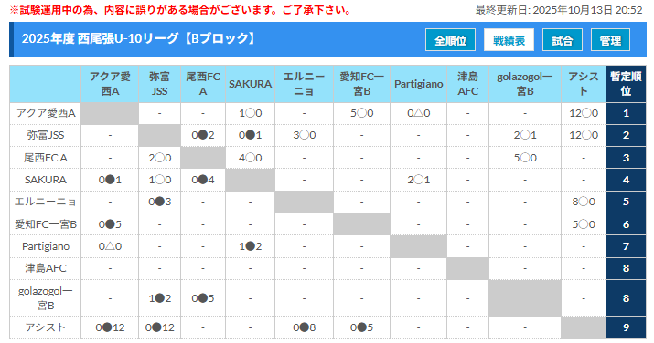 ・U-10リーグの結果を翌年のJA全農杯西尾張地区大会に反映してブロック分けを行う予定