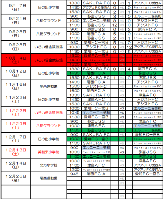 尾西FC A、弥富JSS、エルニーニョ美和、アクアJFC愛西A、SAKURA FC、 Partigiano FC、愛知FC一宮B、アシストFC、FC golazogol一宮B、津島AFC