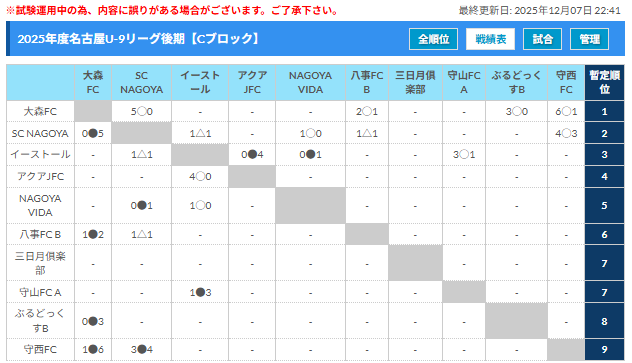FC SIRIUS C、名古屋ぶるどっくすA、八事FC B、大森FC、シルフィード名古屋、FC NexusNagoya、大磯FC、ユニオンSA
