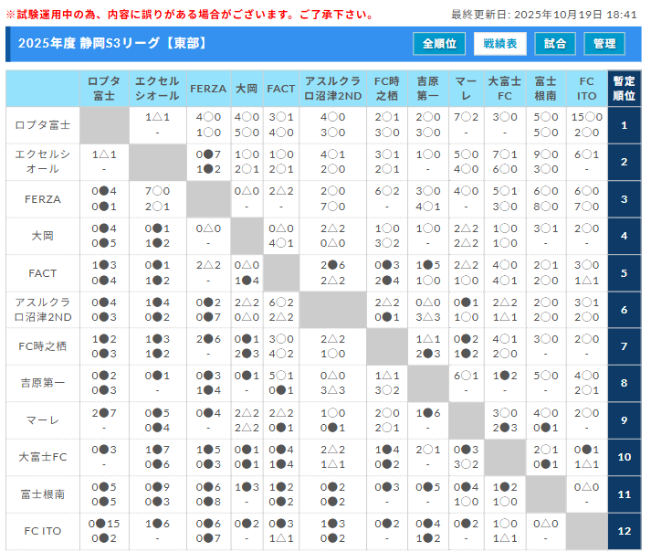 吉原第一JFC、大富士FC、ロプタ富士、エクセルシオール、FACT、大岡SSS、富士根南、マーレFC、アスルクラロ沼津2ND、FC時之栖、FERZA、FC ITO