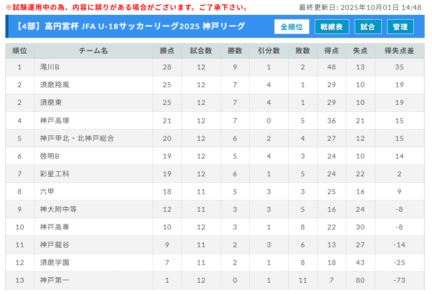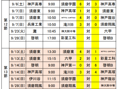4部リーグ 9/28更新 優勝は滝川 あと2試合、9/23神大附中等 vs 六甲、9/28神戸龍谷 vs 須磨学園の情報募集