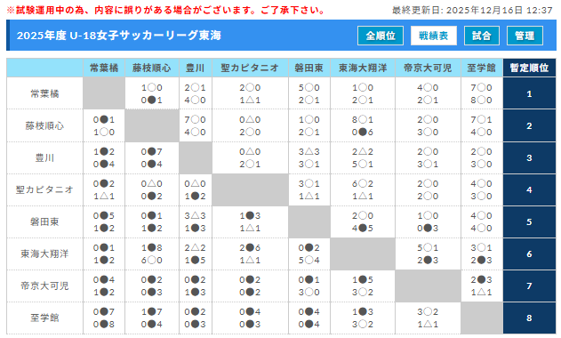 U-18女子サッカーリーグ東海【最終結果】