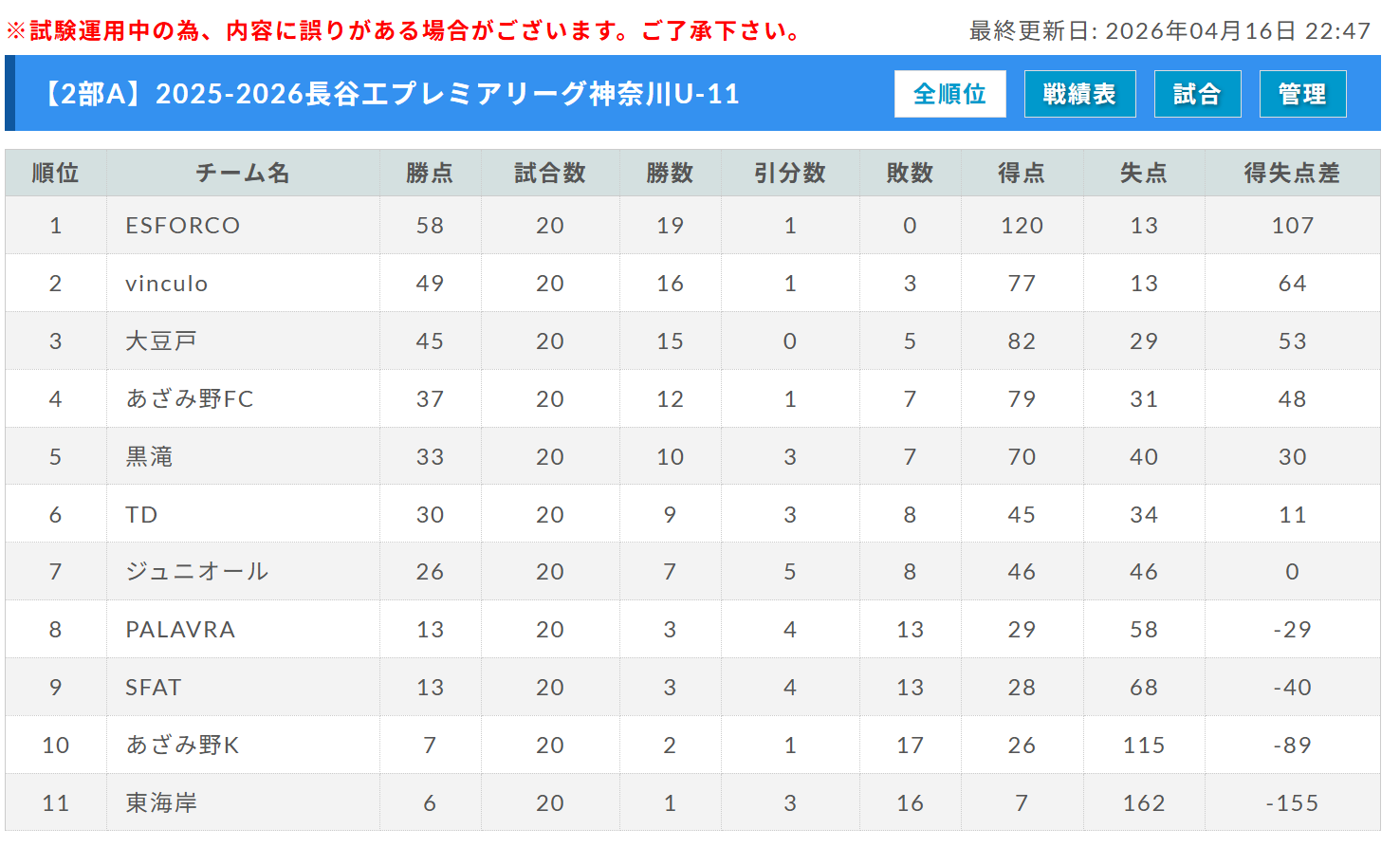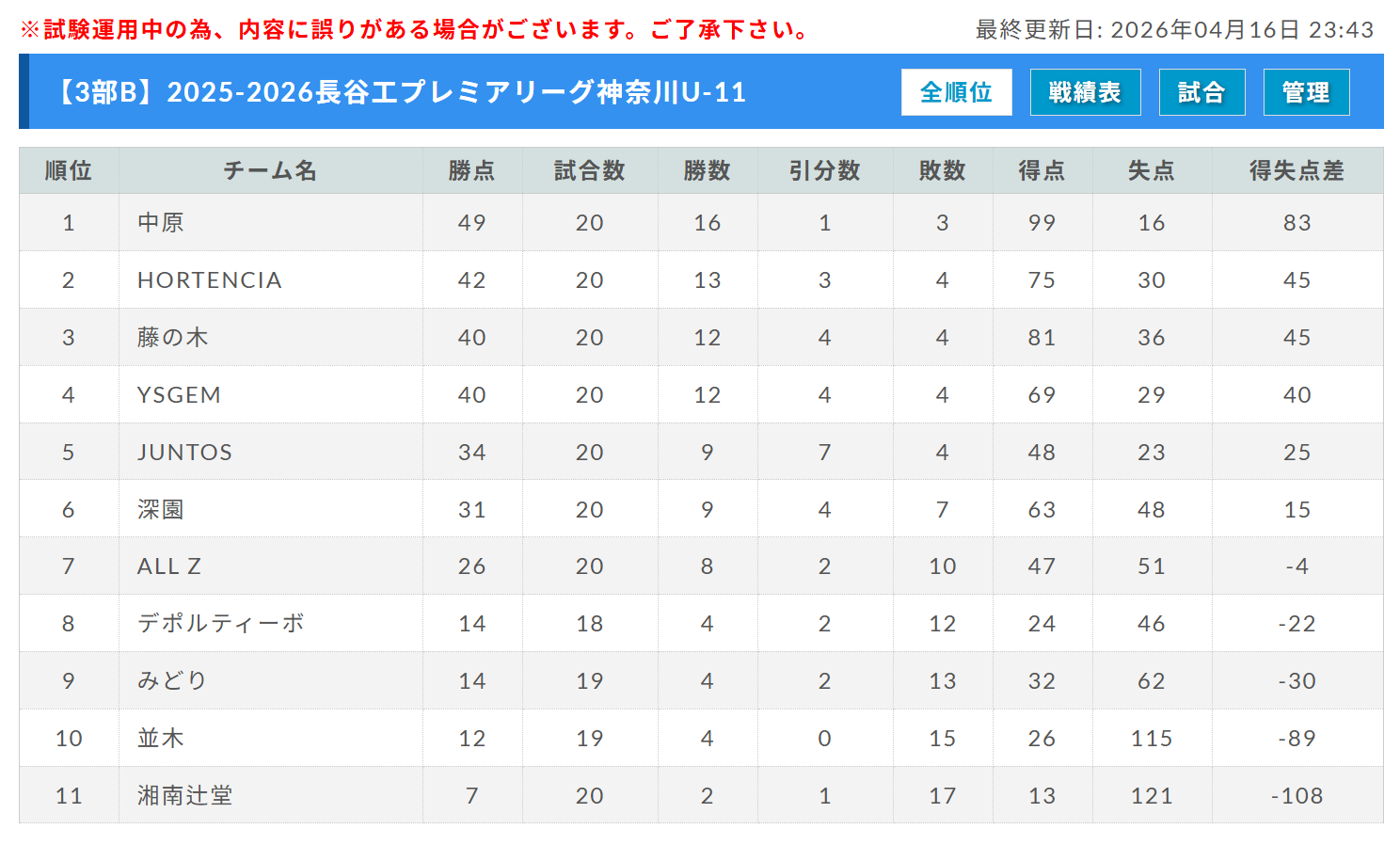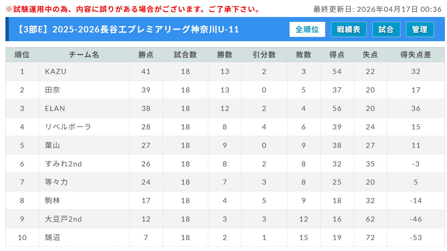 リーグ戦績表