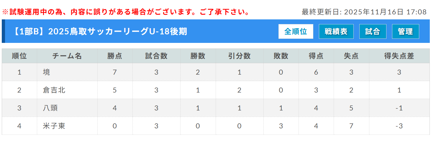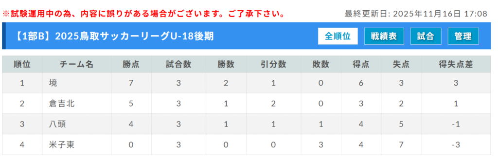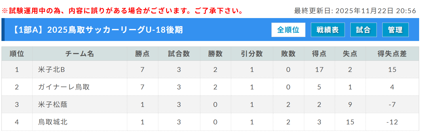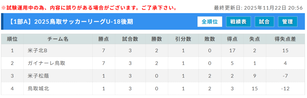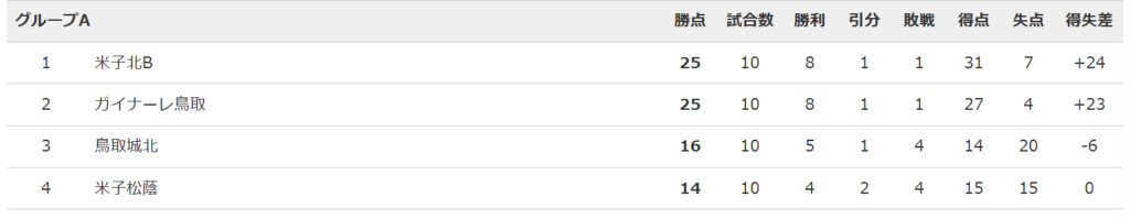1位:米子北B、2位:ガイナーレ鳥取、3位:鳥取城北、4位:米子松蔭
