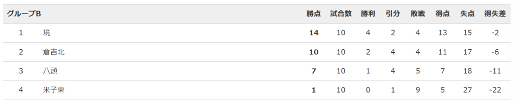 1位:米子北C、2位:ガイナーレ鳥取B、3位:境B、4位:鳥取東、5位:米子松蔭B、6位:鳥取城北B、7位:米子工業、8位:鳥取敬愛