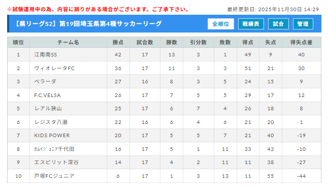 2025年度 第19回埼玉県第4種サッカーリーグ戦 県リーグ S211/30結果掲載!S1結果募集 次回12/14