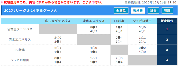 ボルケーノA 最終結果 優勝:名古屋グランパス
