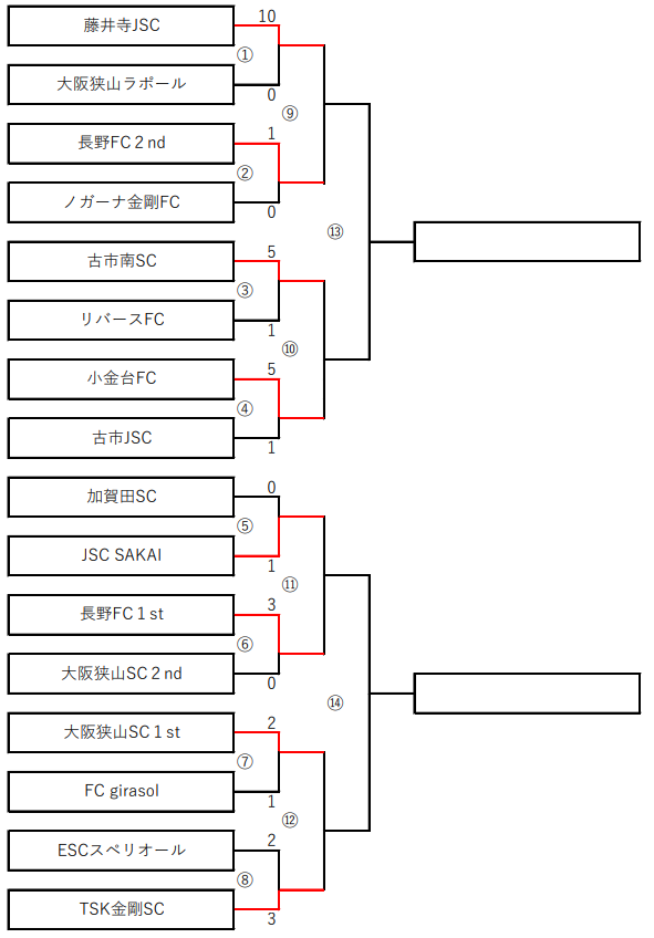 ① 藤井寺JSC(上位2位) 10-0 大阪狭山ラポール(下位A4位)