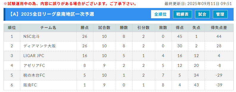 参照元:NSC北斗、ジョイナスFC、大宮JSC、FC岸和田、ゼッセル熊取、貝塚JSC、ディアマンテ大阪、久米田FCVamos、NSC北斗