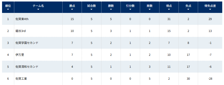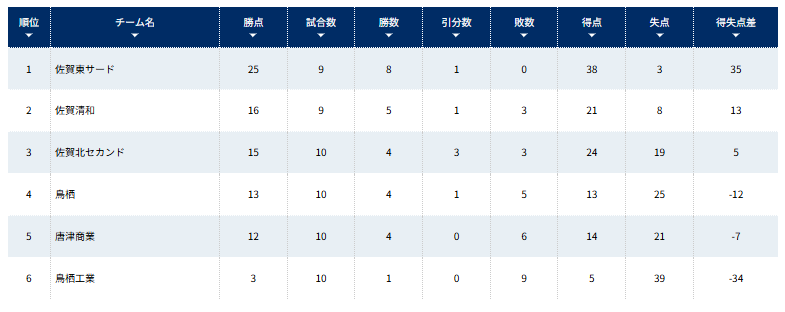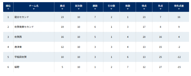 1位:龍谷セカンド、2位:佐賀商業セカンド、3位:佐賀西、4位:唐津東、5位:早稲田佐賀、6位:嬉野