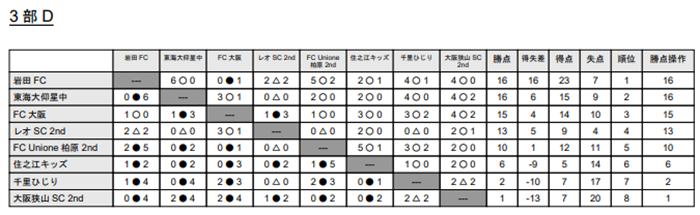 1位:CAOS、2位:A.C.Re:Salto、3位:レオSC、4位:柏田SC、5位:アイリスFC住吉2nd、6位:東淀川FC、7位:ゼッセル熊取、8位:LEVANTE、9位:RESC 2nd、10位:MALAGA CF