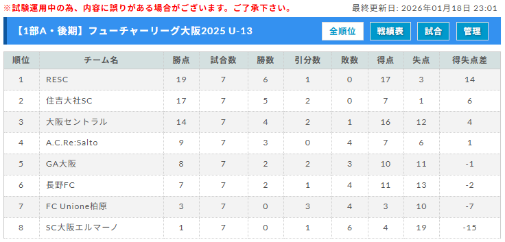 フューチャーリーグ大阪2025 U-13 後期 1/18結果掲載!1部A優勝はRESC!次節1/24.25