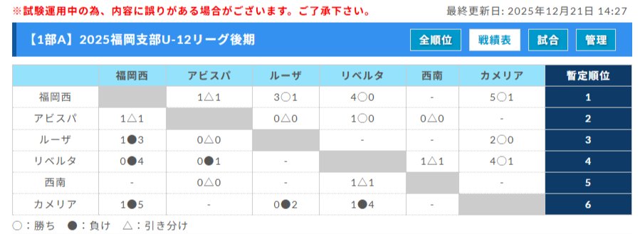 1位:アビスパ、2位:西南、3位:福岡西、4位:ルーザ、5位:カメリア、6位:リベルタ、7位:東福岡、8位:エリア伊都、9位:J-WIN、10位:SALTZ、
