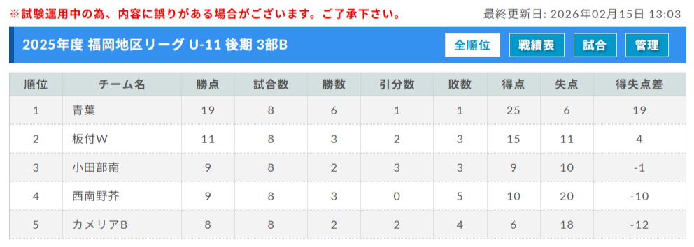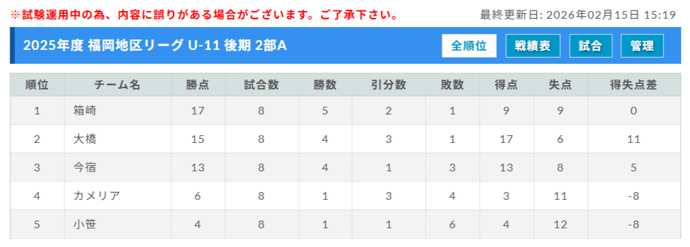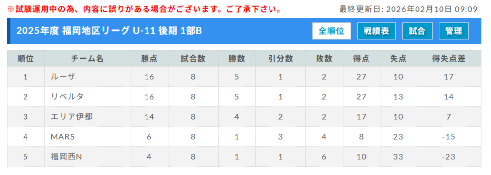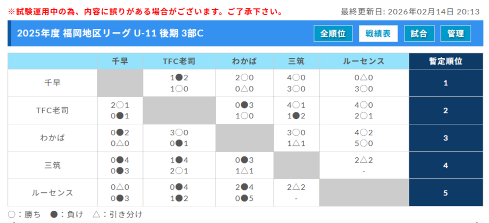 こちらは公式結果ではありません。リーグ戦入力にて誤差が生じますので、正式結果は公式結果を確認してください。