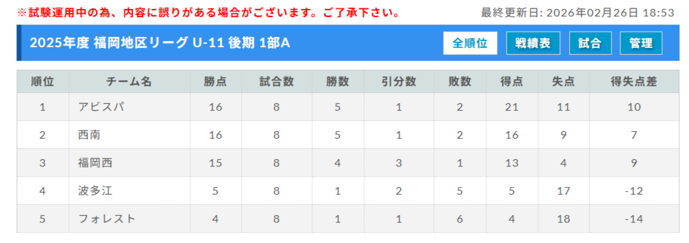 1位:アビスパ、2位:西南、3位:福岡西、4位:波多江、5位:フォレスト