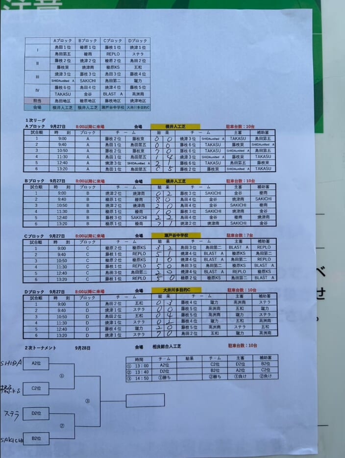 ・4チ-ム4ブロックの1次リーグ戦を行い、各ブロック1位の4チームが県大会出場、各ブロック2位チームの4チームで2次トーナメント戦を行い、1位チームが県大会出場とする。(県大会枠の抽選は、2次トーナメント終了後、会場で行う。)