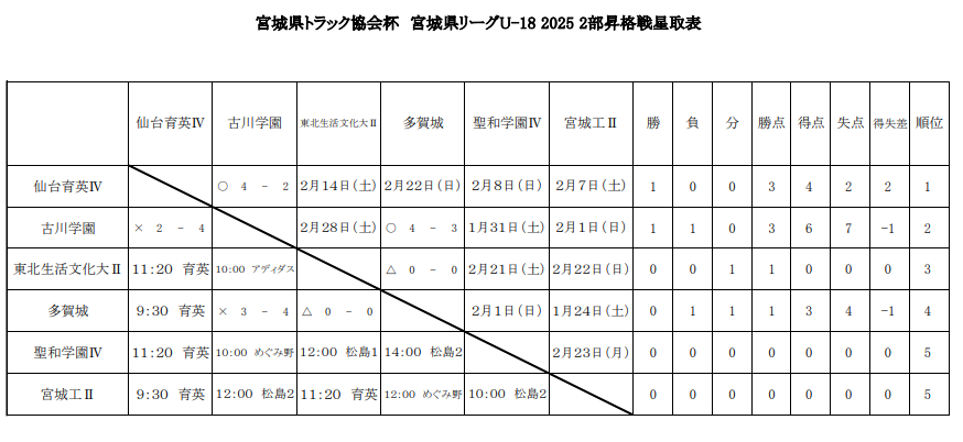 東北学院、聖和学園Ⅱ、ベガルタ仙台Ⅱ、仙台育英Ⅱ、東北、宮城工、利府、仙台大明成