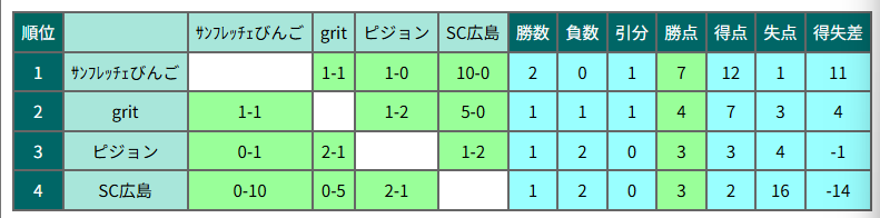 1位:サンフレッチェびんご、2位:grit、3位:ピジョン、4位:SC広島