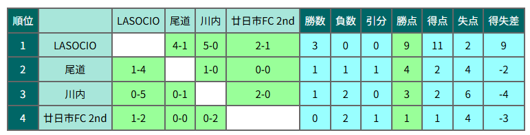 1位:LASOCIO、2位:尾道、3位:川内、4位:廿日市FC 2nd
