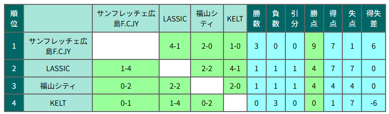 1位:サンフレッチェ広島F.CJY、2位:LASSIC、3位:福山シティ、4位:KELT