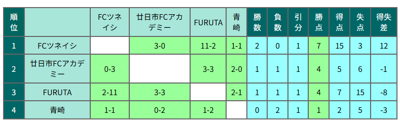1位:FCツネイシ、2位:廿日市FCアカデミー、3位:FURUTA、4位:青崎