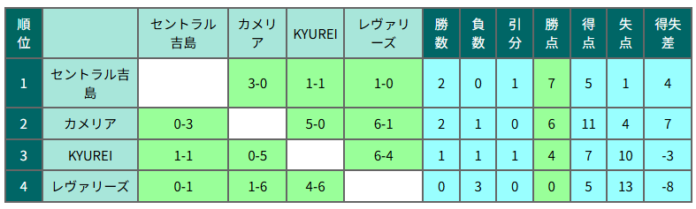 1位:ファルトラーダ、2位:LASSIC、3位:FURUTA、4位:SC広島、5位:ピース、6位:KYUREI、7位:ローザス・セレソン