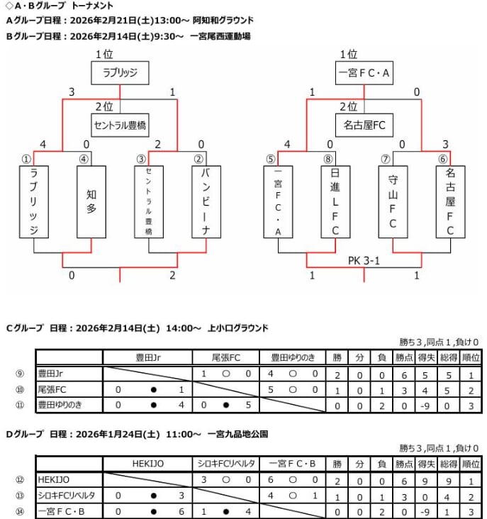 1位:一宮FC A、2位:名古屋FC、3位:日進LFC、4位:守山FC