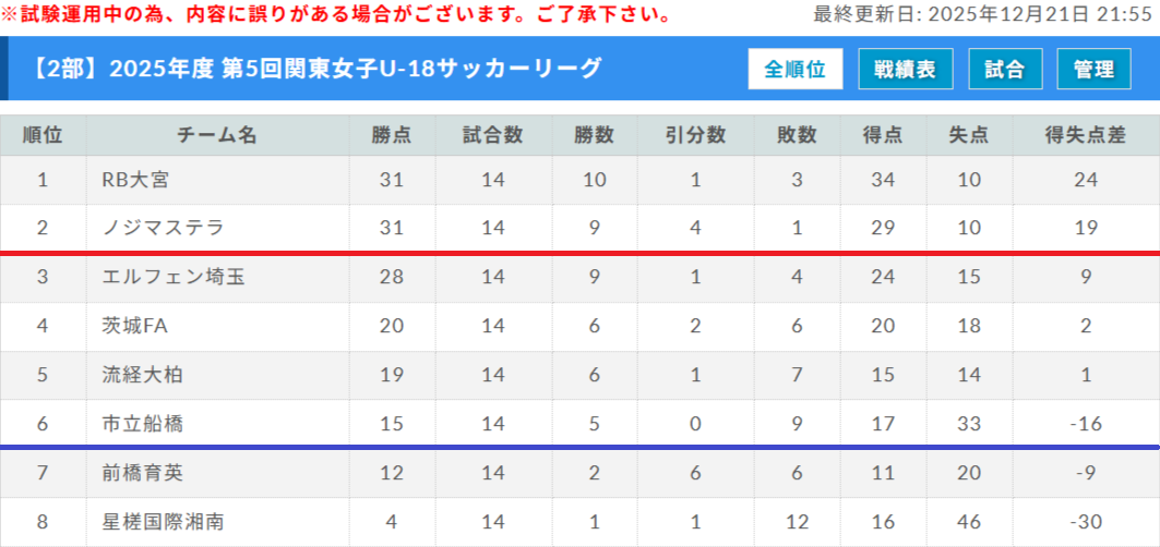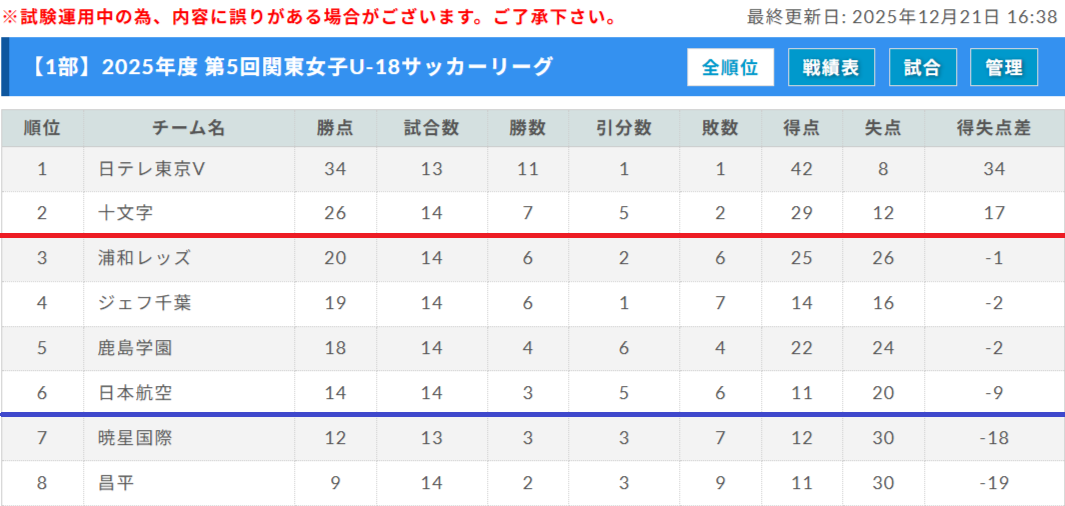 U18女子L 関東 1部 12/21分まで更新(あと1試合)