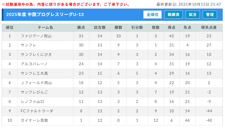 2025年度 中国プログレスリーグU-13 10/11.13結果更新!次回10/18